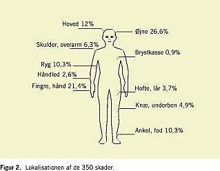 Lokalisationen af skaderne ses af Figur 2 . Skaderne fordelte sig ligeligt mellem højre og venstre side. Som det ses på figuren udgør ankel- og rygdistorsioner en stor del af ulykkerne.