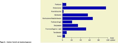Ved de 350 ulykker ses distorsionerne sammen med øjenskaderne at udgøre langt den største del af skadesdiagnoserne (Figur 3 ).