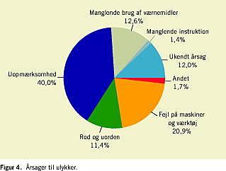 I databasen blev sikkerhedsgruppernes egne vurdering af årsagerne til ulykkerne registreret. I 20% af tilfældene synes ødelagt/forkert udstyr eller hjælpemidler at have haft en betydning for ulykkens opståen (Figur 4 ).