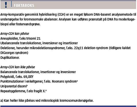 Formålet med denne statusartikel er at gennemgå metoden, indikationsområderne for prænatal brug af array-CGH og etiske overvejelser i forbindelse hermed. Artiklens forfattere har samarbejdet om udarbejdelsen af en national guideline for prænatal array-CGH i regi af Dansk Føtalmedicinsk Selskab og Dansk Selskab for Medicinsk Genetik, og repræsenterer dermed de føtalmedicinske og kliniske genetiske afdelinger i Danmark.