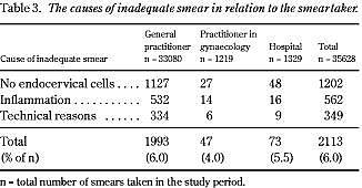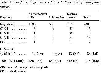Af Tabel 1 fremgår, at 57% af de uegnede smears var uden endocervikale celler, 27% var for betændelsesprægede, og 16% var af teknisk dårlig kvalitet.