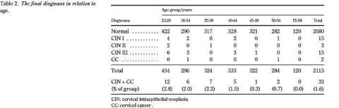 Som det ses af Tabel 1 fandtes 1,6% positive diagnoser (95% CI 1,1-2,2) ved opfølgning. Hyppigheden af neoplasi efter et uegnet smear var højere i den yngre aldersgruppe, 2,4% versus 0,8% (p <0,05) (Tabel 2 ). Blandt de 33 kvinder med en positiv opfølgningsdiagnose fandtes 15 med CIN I, tre med CIN II og 13 med CIN III. Der blev fundet to tilfælde med cervixcancer: en 32-årig kvinde med et forudgående smear, uegnet på grund af blodtilblanding, og en 50-årig kvinde med et forudgående smear, uegnet pga. manglende endocervikale celler.