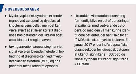 Patients with persistent cytopenia are frequently referred to the haematological departments , and a diagnosis of myelodysplastic syndrome is often suspected. After routine assessment including a broad range of blood tests, bone marrow biopsy, and cytogenetics, a definite diagnosis can still not be found for some patients, although they have symptomatic cytopenia. In these cases, next generation sequencing is a valuable supplement in identifying patients with early stages of myeloid cancer.