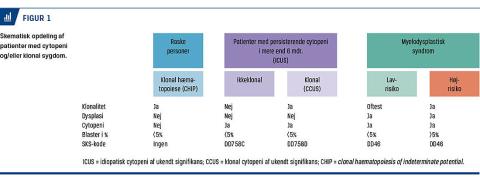 i risiko for at progrediere til mere aggressiv sygdom over en årrække. Derimod ser det ud til, at patienter uden mutationer, men med persisterende cytopeni sjældent har risiko for at få malign hæmatologisk sygdom [9, 19]. I denne sygdomsgruppe skal man i stedet undersøge grundigt for andre årsager til persisterende cytopeni, f.eks. alkoholmisbrug, reumatologisk lidelse, anden cancer, autoimmune cytopenier eller arvelig disposition.