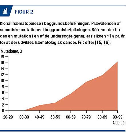 Mutationer i MDS-associerede gener kan også findes hos tilsyneladende raske ældre. Dette kaldes klonal hæmatopoiese, og prævalensen stiger med alderen (Figur 2). Således har ca. 10% af befolkningen på 70 år mutation i en af de gener, som oftest er muteret i MDS [15, 16]. Hvis man har klonal hæmatopoiese øger det risikoen med en faktor 12 for senere at få myeloid eller lymfoid hæmatologisk cancer. Sygdomsudviklingen er på ca. 1% pr. år ved disse mutationer, hvilket er omtrent det samme som risikoen for at få myelomatose, hvis man har en monoklonal gammopati af ukendt signifikans. Pga. den lave årlige incidens af hæmatologisk cancer hos tilsyneladende raske personer med disse mutationer og manglende vidende om behandlingseffekter kan det i øjeblikket ikke anbefales at anvende mutationsanalyse som screening hos den raske befolkning uden cytopeni. Det er desuden ukendt, hvilke risikofaktorer der er for at få manifest hæmatologisk sygdom, hvis man har mutation i et af disse gener. Klonal hæmatopoiese, altså en tilfældigt opdaget mutation uden tilhørende cytopeni, betegnes internationalt