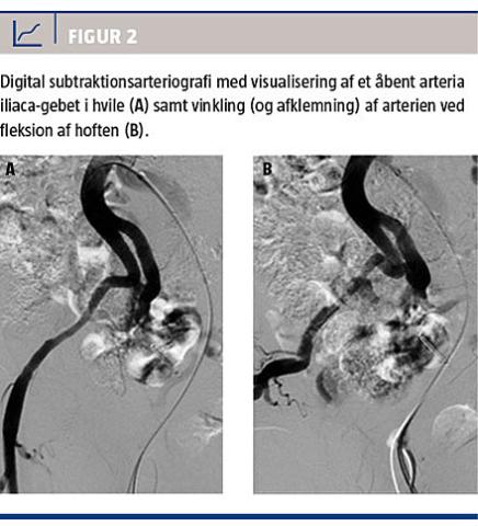 Det karakteristiske arteriografiske fund ved arteria iliaca-endofibrose er en excentrisk stenose, der inddrager arteria iliaca externa. Vinkling af arterien kan ofte visualiseres ved fleksion i hofteled (Figur 2)