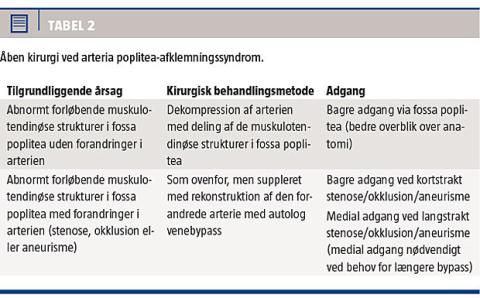 Behandlingen består i de ukomplicerede tilfælde i åben kirurgi med dekompression af arteria poplitea. Formålet med indgrebet er dels at ophæve patientens claudicatiogener, dels at forebygge tromboemboliske komplikationer [11, 25]. Den kirurgiske korrektion af den anatomiske abnormitet med deling af de muskulotendinøse strukturer, der afklemmer arterien, skal suppleres med arteriel rekonstruktion med autolog venebypass ved okklusion eller aneurismatisk omdannelse af arterien (Tabel 2) [9, 11, 25].