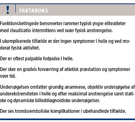 Funktionel arterie iliaca-obstruktion og arterie poplitea-afklemningssyndrom er sjældne og ofte underkendte årsager til arteriel insufficiens hos yngre eliteatleter. Yngre atleter, der oplever claudicatiolignende symptomer ved svær fysisk anstrengelse eller gradvis forværring af deres atletiske præstation som følge af claudicatio, bør henvises til karkirurgisk vurdering.