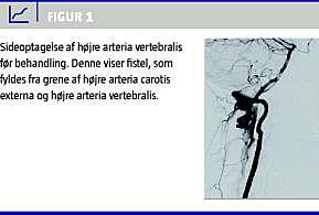 På mistanke om arteriovenøs fistel eller malformation blev der foretaget magnetisk resonans (MR)-angiografi samt efterfølgende digital subtraktionsangiografi. Der blev påvist en dural arteriovenøs fistel på højre side af halsen i C1-niveau. Fistlen blev fyldt fra grene fra højre arteria carotis externa og højre arteria vertebralis (Figur 1 ).