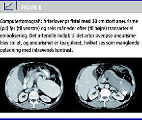 Denne sygehistorie demonstrerer vigtigheden af at have opmærksomheden rettet mod de sjældent forekommende komplikationer, som medfører kardiopulmunale symptomer forårsaget af arteriovenøs fistulering som følge af traumatiske læsioner og operative indgreb. Den viser, at transarteriel coiling hos denne patient var en effektiv metode til lukning af en stor AV-fistel. Endelig demonstrerer den vigtigheden af at erindre sjældent forekommende årsager til portal hypertension.