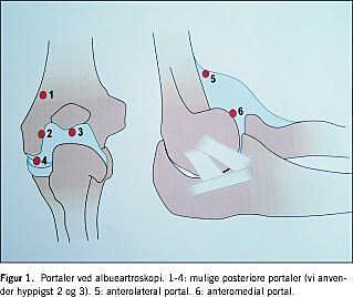 Teknisk udføres operationen sædvanligvis i generel anæstesi og blodtomhed, enten i lateral decubitusposition [7, 9], eller som i vort set-up i rygleje og hånden i ophæng, der muliggør fri bevægelighed i albueleddet peroperativt. Præoperativt injiceres 20 ml saltvand eller lokalanalgetika i leddet for at facilitere indføring af artroskopet [9]. Anatomisk ligger tre betydningsfulde nerver, hvoraf n. radialis og n. ulnaris optegnes præoperativt, samt underarmens karforsyning placeret omkring leddet, hvilket nødvendiggør en omhyggelig portal placering [3, 6, 9]. Vi anvender to anteriore portaler (anterolateral og anteromedial) til anterior capsulektomi, uddybning af fossa coronoidea, fjernelse af ledmus og eksostoser på proc. coronoideus. Endvidere anvender vi to posteriore portaler til posterior capsulektomi, uddybning af fossa olecrani, fjernelse af ledmus og eksostoser på olecranon (Figur 1 ).