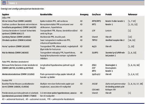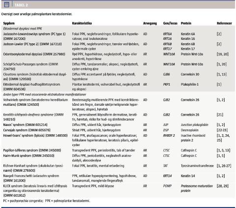 Variation i den kliniske præsentationsform (fænotypen), overlap af forskellige tilstande, publikation af mange enkelttilfælde og brug af eponymer betyder, at klassifikationen af hereditær PPK er kompliceret, og det kan være vanskeligt at få overblik over emnet [1]. I de seneste to årtier er der sket en stor molekylærgenetisk udvikling, hvorved mange genetiske defekter bag hereditær PPK er kortlagt. Dette har givet ny indsigt i de biologiske mekanismer, som finder sted i den palmoplantare hud. De involverede gener koder for forskellige proteiner, som blandt andet har betydning for epidermal differentiering og dannelsen af cornified envelope. Afhængig af vævsfordelingen af disse proteiner og lokalisation af mutationer i generne, der er knyttet hertil, kan det kliniske spektrum af arvelig PPK variere fra isoleret PPK til komplekse tilstande med associeret høretab, øjensygdom, tandanomalier, mental retardering, kardiale komplikationer eller maligne tumorer [1, 4]. Kendskab til de genetiske forhold har ført til, at tilstande, som man tidligere betragtede som forskellige sygdomsenheder, har vist sig at være identiske (f.eks. PPK Vörner og PPK Unna-Thost), og omvendt kan defekter i samme gen være årsag til forskellige syndromer [3-5]. Man har derfor foreslået, at fremtidig klassifikation af PPK bør baseres på et molekylærgenetisk grundlag, hvilket vil muliggøre en mere præcis diagnostik. Arvelig PPK er katalogiseret i Online Mendelian Inheritance in Man-databasen med et unikt referencenummer forudgået af #, hvis den molekylærgenetiske baggrund er kendt [6].