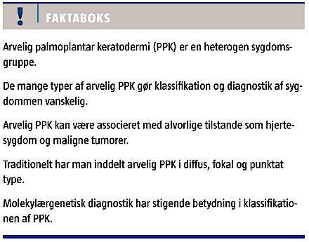 Palmoplantar keratodermi (PPK) er en stor og heterogen gruppe af hudsygdomme, som klinisk er karakteriseret ved fortykket hud i håndfladerne og på fodsålerne. PPK findes i såvel erhvervede som arvelige former [1, 2]. Denne artikel omhandler arvelig PPK, som kan forekomme isoleret palmoplantart, men også ses med mere udbredte hudforandringer eller være associeret med ekstrakutane manifestationer som led i mere komplekse syndromer. Arvelig PPK er en relativt almindeligt forekommende hudsygdom. Traditionelt har man klassificeret arvelig PPK i diffus, fokal og punktat type [3]. Yderligere underinddeling kan gøres på baggrund af morfologi, lokalisation, debut, lys- og elektronmikroskopiske fund, arvegang samt evt. biokemiske defekter og ekstrakutane manifestationer.