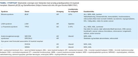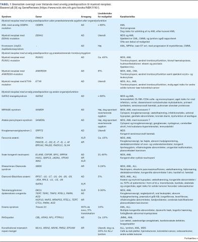 I lang tid har opfattelsen været, at myeloid neoplasi (MN) opstår sporadisk med ukendt ætiologi, fraset udvikling af myelodysplastisk syndrom (MDS) og akut myeloid leukæmi (AML) efter kemo-/stråleterapi. I takt med den hastige udvikling af next generation-sekventering (NGS) har det vist sig, at en undergruppe af patienter har germline-varianter, der er associeret med en øget risiko for udvikling af MN, hvilket internationalt betegnes som hereditary myeloid neoplasms (hMN). Det er primært risikoen for udvikling af MDS og AML, som er øget. Patogene germline-varianter er i de seneste år identificeret i adskillige gener såsom GATA2, ETV6, DDX41 og SAMD9L [1-4]. Incidensen af AML og MDS var hhv. 173 og 252 i Danmark i 2018 [5], og det estimeres, at ca. 10% af disse havde en patogen germline-variant [6-8]. Livstidsrisikoen for at udvikle MDS og AML spænder fra 10% til 90%, afhængigt af det involverede gen, typen af variant og modificerende, ukendte faktorer [9, 10]. I 2016 inkluderede WHO prædisposition til MN som en selvstændig sygdomsenhed i deres klassifikation [11]. I 2019 udgav Nordic MDS Group (NMDSG) en guideline til identifikation, diagnostik og behandling af patienter med hMN [9].