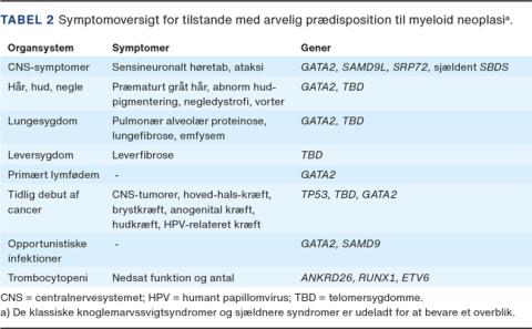 Det er svært at lave en strømlinet algoritme for udredning af hMN, da de enkelte sygdomme er vidt forskellige (Tabel 1). Generelt er det vigtigt med en grundig familieanamnese, inkl. optegning af stamtræ, opmærksomhed på tidlig debut af sygdom, grundig gennemgang af medicinsk historik samt objektiv undersøgelse. Et mere systematisk spørgeskema om symptomer i relation til hMN er udformet af Churpek et al [12]. NMDSG har opstillet følgende kriterier for, hvem der bør henvises til genetisk udredning [9]: 1) Patienter med MN og en familieanamnese, der tyder på arvelig sygdom, eller patienter med symptomer, der giver mistanke om et syndrom, der er associeret med hMN (Tabel 2). 2) Patienter med MN hvor den diagnostiske udredning har afsløret mutationer i tumorvæv, som kunne være germline (nærheterozygot variant allelfrekvens (VAF) 40-60%, eller nærhomozygot VAF over 90%). Det drejer sig bl.a. om mutationer i RUNX1, ETV6, DDX41, GATA2 og TP53, der kan være af såvel somatisk som germline-oprindelse. 3) Patienter, som ikke opfylder de første to kriterier, men som har MDS eller AML med aberration af kromosom 7 diagnosticeret, inden de fyldte 50 år.