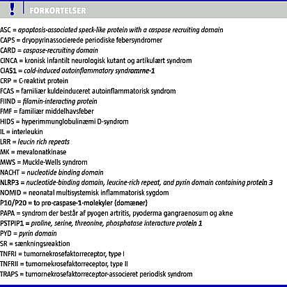 I 1999 fandt man et locus for både FCAS og MWS på kromosom 1q, og i 2001 identificeredes mutationer i et 9-exon gen i såvel FCAS- som MWS-familier [22]. Året efter fandtes mutationer i samme gen hos patienter med CINCA, dog kun hos ca. halvdelen [23]. Genet kaldtes oprindeligt CIAS1 (cold-induced autoinflammatory syndrom-1), senere NAPL3, men har nu betegnelsen NLRP3 (nucleotide-binding domain, leucine-rich repeat, and pyrin domain containing protein 3 , og det koder for proteinet cryopyrin (NLRP3) [24]. Stimulering af cryopyrin medfører dannelse af et makromolekylekompleks, der kaldes »NLRP3-inflammasomet« (Figur 1 ). Den resulterende homooligomerisering af procaspase-1 faciliterer en autokatalytisk dannelse af caspase-1, som igen er ansvarlig for at spalte pro-IL-1β til IL-1β, som er udtalt proinflammatorisk. En mulig forklaring for patogenesen bag CAPS kan være, at NLRP3-genmutationen, der hyppigst sidder i exon 3 (NACHT-domænet), svækker interaktionen mellem inhibitorer og NLRP3, hvorved dannelsen af IL-1β fremmes [18].
