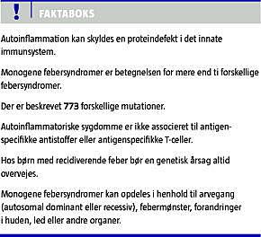 I 1999 introduceredes begrebet systemiske autoinflammatoriske sygdomme, der er karakteriseret ved episoder af tilsyneladende uprovokeret inflammation [1]. I modsætning til autoimmune sygdomme, mangler disse sygdomme antigenspecifikke antistoffer og antigenspecifikke autoreaktive T-celler. Da feber er hovedsymptomet ved disse autoinflammatoriske sygdomme, anvender man ofte betegnelsen periodisk feber [2]. De monogene hereditære periodiske febersygdomme omfatter blandt andet familiær middelhavsfeber (FMF), hyperimmunglobulinæmi D syndrom (HIDS), tumornekrosefaktor (TNF)-receptor-associeret periodisk febersyndrom (TRAPS) og cryopyrinassocierede periodiske febersyndromer (CAPS). De seneste års forskning på området har afdækket betydelig ny viden om genetikken og de patogenetiske årsager til feber, hvilket danner baggrund for nærværende oversigtsartikel.