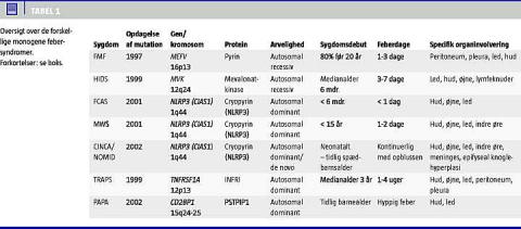 De monogene hereditære periodiske febersyndromer er en samlebetegnelse for en række systemiske autoinflammatoriske sygdomme (se oversigten i Tabel 1 ). Disse lidelser har fået et fundament i de syndromspecifikke gener, der videre har dannet grundlaget for forskningen i patogenesen bag syndromerne og derved skabt koblingen fra genmutation til klinik. Ved FMF og CAPS er dette i store træk klarlagt, men det er i mindre grad tilfældet ved HIDS og TRAPS. Herudover har udviklingen i forståelsen af syndromerne medført nye muligheder inden for behandling: fra brugen af kolkicin ved FMF på baggrund af erfaringer fra kliniske observationer til brugen af IL1-hæmmere ved CAPS ud fra kendskab til patogenesen. Desværre har man endnu ikke for alle monogene febersyndromer fundet en specifik behandling med overbevisende effekt, og hos størsteparten af de patienter, der har periodisk feber, har vi stadig ikke nogen patogenetisk forklaring på, hvorfor feberen optræder. Trods talrige undersøgelser er der ved andre autoinflammatoriske sygdomme som systemisk juvenil idiopatisk artritis, morbus Behçet og PFAPA ikke fundet nogen genetisk årsag.