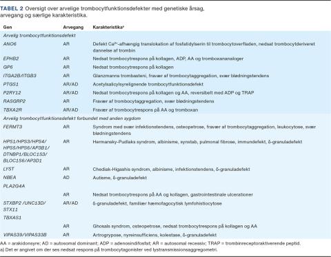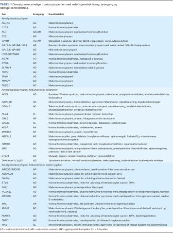 Der er i dag identificeret mere end 60 forskellige gener associeret til arvelige trombocytsygdomme [8]. Nogle af disse gener har funktion i flere væv, og varianter heri kan være forbundet med syndromer, der rækker ud over det hæmostatiske system. De arvelige trombocytsygdomme kan inddeles i arvelige trombocytopenier (Tabel 1) og arvelige trombocytfunktionsdefekter (Tabel 2) med normalt trombocyttal. Begge kan være forbundet med syndromer, og arvelig trombocytopeni kan også være forbundet med andre sygdomme [9]. Blødningsfænotypen er mukokutan og omfatter blødninger fra slimhinder og hud, menoragi samt forlænget blødningstid ved kirurgi og fødsler. Blødningstendensen kan variere fra ingen blødning (isoleret mild trombocytopeni) til svær blødningstendens med livstruende blødningsepisoder [10].