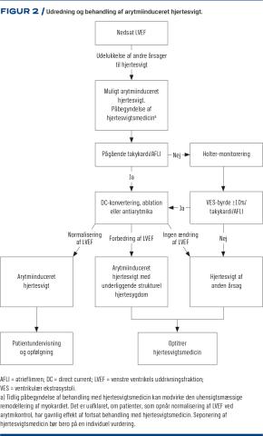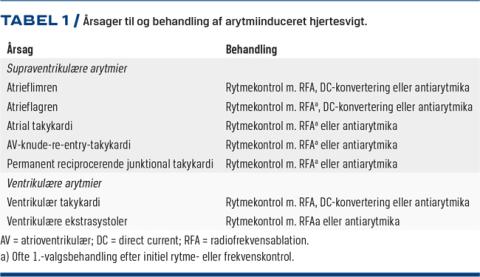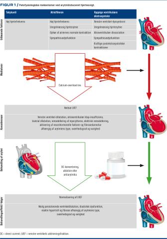 Alle supraventrikulære arytmier med påskyndet ventrikelaktion kan medføre arytmiinduceret hjertesvigt (Tabel 1). En hyppig årsag til takykardiinduceret hjertesvigt er atrieflagren, men også ventrikulære takykardier kan udløse klinisk hjertesvigt. Sværhedsgraden af arytmiinduceret hjertesvigt er korreleret med takykardiens varighed og frekvens. Den patofysiologiske mekanisme bag takykardiinduceret hjertesvigt er ikke fuldt klarlagt. Dyreforsøg og undersøgelser af forandringer i hjerter hos mennesker har bidraget til at belyse nogle af mekanismerne. Ved længerevarende takykardi øges belastningen af myokardiet. Dette kan medføre kontraktil dysfunktion og herigennem aktivering af neurohormonelle faktorer, hvilket leder til remodellering af myocytterne med fibrosedannelse og dermed elektrisk remodellering. Studier viser, at ændret metabolisme, calcium-overload, oxidativ stress og iskæmi spiller en rolle i udviklingen [8-10]. Resultatet er nedsat LVEF, forhøjede fyldningstryk, nedsat minutvolumen og øget systemisk vaskulær modstand. Forandringerne kan medføre biatrial og ventrikulær dilatation samt udvikling af hæmodynamisk betydende sekundær mitral- og tricuspidalinsufficiens [11, 12].