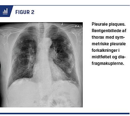 Pleurale plaques forekommer hyppigt blandt tidligere asbesteksponerede, og de kan ses efter forholdsvis beskeden eksponering [10]. Pleurale plaques påvises ofte tilfældigt i forbindelse med røntgenfotografering af thorax. Pleurale plaques er normalt en benign asymptomatisk manifestation, der udtrykker, at man har været udsat for asbest. Pleurale plaques kan i sjældne tilfælde, hvor de er udbredt som et panser, være associ-eret med nedsat FVC og dyspnø [7, 11]. Rygning øger ikke risikoen for pleurale plaques [7]. Patologisk drejer det sig om multifokal og bilateral fibrose i pleura pari-etalis, der dannes efter en inflammatorisk reaktion, og som sjældent viser sig før 20 år efter asbestudsættelsen [7]. Forandringerne kan kalcificere og progrediere efter eksponeringsophør [7]. De pleurale plaques sidder typisk over diagfragmakuplen, i den mediastinale pleura eller følger costa 6-9 lateralt og bagtil [7, 8]