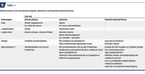 Forekomsten af asbestose og pleurale plaques er ikke faldende. Asbestose kan være underdiagnosticeret pga. tidligere forekommende fejl i de danske ICD-10-koder. Asbestose diagnosticeres ved typiske radiologiske fund ved HRCT og dokumentation for betydelig asbesteksponering. Ved mistanke om asbestose henvises patienten til lunge- og arbejdsmedicinsk vurdering. Begge lidelser er anmeldepligtige. Patienter med pleurale plaques behøver normalt ikke opfølgning. Ved asbes-tose opfordres til rygestop og influenza- og pneumokokvaccination samt opfølgning hvert 3.-5. år med spirometri og udspørgen om symptomer, dog hyppigere hos patienter, der har symptomer og nedsat lungefunktion.