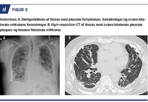 I Helsinkikriteri-erne anbefaler man som førstevalg røntgenoptagelse af thorax med anvendelse af Inter-national Labour Orga-nizations klassifikationssystem til vurdering af diagnosen og brug af CT i tvivlstilfælde [10, 12]. Røntgenop-tagelser af thorax viser normale forhold hos 10-18% af personer med asbestose [9]. Desuden er CT og især high-resolution (HR)-CT mere specifik og sensitiv end røntgenoptagelse [7] og anbefales som førstevalg af Dansk Lungemedicinsk Selskab [2]. Figur 3 viser typiske eksempler på røntgenoptagelse og HRCT. HRCT er især værdifuld: 1) til identifikation af tidlige stadier af asbestose, 2) ved fund af grænsetilfælde af lungefibrose ved almindelig røntgenoptagelse af thorax, 3) ved fund af normale forhold på røntgenoptagelse af thorax, men lungefunktion med et restriktivt billede, 4) ved udbredte pleurale forandringer, der slører lungeparenkymet på et røntgenbillede, og 5) ved mistanke om interstitiel lungesygdom [10, 14]. Ved tolkning af CT-billeder benyttes international classification of HRCT for occupational and environmental diseases [15]. Det er en særlig diagnostisk udfordring, når billedet ligner idiopatisk pulmonal fibrose, men der samtidig er pleurale plaques, eller omfanget af asbesteksponeringen er usikkert. Patienterne bør ud over udredning på en arbejdsmedicinsk klinik og på en lungeafdeling også drøftes på en tværfaglig konference mhp. at stille en endelig diagnose. Lungefunktionsun-dersøgel-ser bør omfatte måling af forceret ekspiratorisk volumen i første sekund, FVC, statiske lungevolumina (TLC og residualvolumen) samt måling af DLCO [7].
