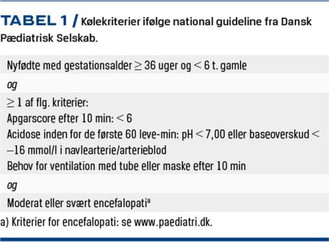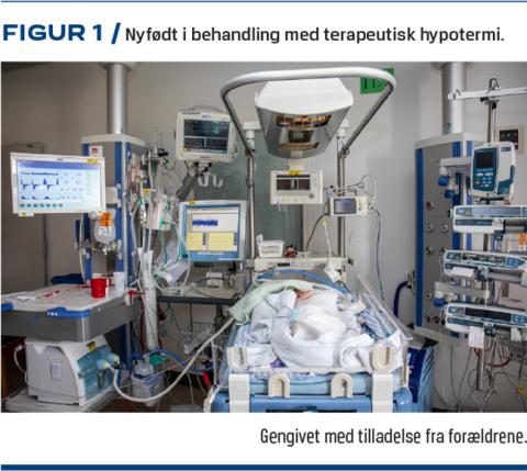 Køling, eller terapeutisk hypotermi (TH), er en gammel behandlingsmodalitet. Napoleons feltlæge, baron Dominique Jean Larrey, noterede blandt andet i sine memoirer, hvordan TH havde en lokal vævsbeskyttende effekt [12]. I forsøg med nyfødte grise og lam kunne man påvise en reduktion af hjerneskade i den sekundære fase efter perinatal iltmangel hos kølebehandlede dyr [13,14]. Dette gav anledning til det første kontrollerede safety trialmed TH hos nyfødte børn i 1998 [15]. I dette studie blev 12 børn kølede, og 10 børn blev behandlet efter de vanlige principper.Man kunne påvise, at behandlingen var sikker, og et opfølgende studie fra 2001 tydede på en neuroprotektiv effekt [16]. I de efterfølgende år blev der gennemført flere store, internationale, randomiserede, kontrollerede studier, og i et Cochranereview fra 2013 konkluderede man, at TH ved moderat til svær HIE var associeret med omkring 25% reduceret risiko for død eller moderate til svære neurologisk men (relativ risiko: 0,75, 95% konfidens-interval: 0,68-0,83); number needed to treat (NNT)var 7[17]. Det er nu også påvist, at TH på længere sigt resulterer i øget overlevelse, nedsat risiko for cerebral parese og svære handikap samt reduceret tab af IQ vurderet ved 6-7-årsalderen[18]. Data fra prækliniske undersøgelser indikerer, at TH virker ved bl.a. at hæmme oxidativt stress, ødemdannelse og sekundær celledød [9].TH er i dag etableret standardbehandling af nyfødte med moderat til svær HIE. Behandlingen består af aktiv nedkøling i 72 timer til 33,5 C og foregår på landets fire universitetshospitaler (Figur 1 og Figur 2). Kriterierne for TH og behandlingsprincipperne følger internationalt accepterede retningslinjer (Tabel 1) [19]. Hvis et barn opfylder kriterierne for TH, men ikke er født på et hospital,hvor man tilbyder denne behandling, påbegyndes passiv nedkøling til 33,5 C, efter at barnet er stabiliseret, hvorefter det flyttes via den neonatale transportordning til et af de fire centre. Da TH virker på patofysiologiske mekanismer i den sekundære fase, skal behandlingen initieres senest seks timer efter fødslen. Jo hurtigere TH påbegyndes, desto bedre ser den neuroprotektive effekt ud til at være [20]. Hurtig diagnostik og behandling er derfor altafgørende.