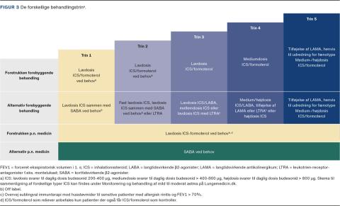 Astma kan ud fra den behandling, som er nødvendig for at holde patienten velkontrolleret og undgå eksacerbationer, inddeles i mild, moderat og svær astma. Det er estimeret, at 50-75% har mild astma [6]. Den klassiske inddeling i dag er i forhold til hyppigheden, men uafhængigt af sværhedsgraden af symptomer: kontrol, delvis kontrol og ukontrolleret astma. Førstevalget til behandling af mild astma har i mange år været monoterapi med korttidsvirkende β2-agonister (SABA) efter behov. Nyere studier har vist, at behandling med en kombination af inhalationssteroid (ICS) og langtidsvirkende β2-agonister (LABA) sikrer bedre astmakontrol og færre eksacerbationer end SABA [7, 8]. Dette gælder både som fast og som behovsmedicin. Man er derfor gået væk fra behandling med SABA i monoterapi, da den underliggende inflammation ikke behandles, og der er set øget risiko for eksacerbationer [4, 6, 9].