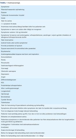 Det kan være relevant med udredning for allergi og rinitis, da op mod 60% af unge og yngre voksne med astma har allergi, samt at undersøge for erhvervseksponering som udløsende årsag [3]. Røntgen af thorax kan være relevant for at udelukke en række differentialdiagnoser, f.eks. luftvejsinfektion, KOL og bronkiektasi, men anbefales ikke rutinemæssigt [3]. Det er vigtigt at være opmærksom på eventuelle overlappende og behandlingskrævende sygdomme, komorbiditeter samt livsstils- og miljøfaktorer, der kan præsentere sig med astmalignende symptomer og dermed give et fejlagtigt indtryk af svær eller behandlingsresistent astma [13], Tabel 1.