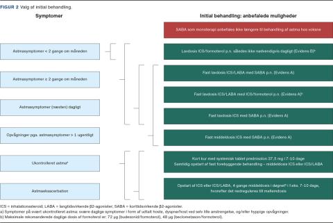 Patienten skal, helst inden påbegyndelse af behandling, udredes systematisk for at bekræfte astmadiagnosen og udelukke alternative diagnoser. Den initiale behandling vælges ud fra patientens symptombillede og -hyppighed, jf. Figur 2.
