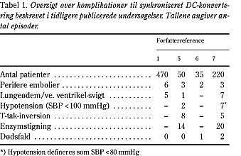 Tabel 1 viser de i litteraturen beskrevne komplikationer til synkroniseret DC-konvertering, indsamlet i større oversigtsarbejder. Alle arbejder er af ældre dato (offentliggjort i 1964-1967).