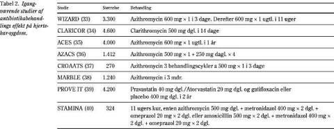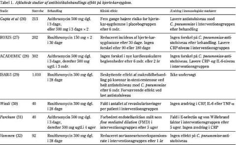 Tidligere har man i to mindre randomiserede interventionsstudier fundet en signifikant lavere incidens af kardiovaskulære komplikationer hos makrolidbehandlede end hos placebobehandlede, tre til seks måneder efter behandlingen (26, 27).