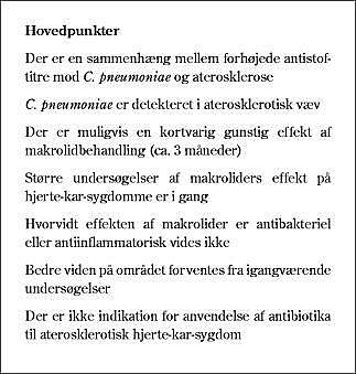 Forskellige infektiøse agenser har i de senere år været mistænkt som mulig årsag til aterosklerose. Den bedst undersøgte af disse er Chlamydia pneumoniae , som forårsager øvre og nedre luftvejs-infektioner. Emnet har tidligere været indgående behandlet i Ugeskriftet. Der er imidlertid en hastigt voksende mængde ny litteratur på området, og en opdatering heraf synes således at være relevant (1-3). Serologiske studier har vist, at en stor del af alle voksne har antistoffer mod C. pneumoniae (4), og høje antistoftitre er fundet at have sammenhæng med aterosklerose, ligesom bakterien er fundet i aterosklerotisk væv. Skulle aterosklerose være en infektiøs sygdom, ville helt nye behandlingsformer kunne overvejes, samtidig med at dette ville få en afgørende indflydelse på antibiotikaforbrug og resistensudvikling. En undersøgelse fra 1999 viste, at 4% af de amerikanske læger havde anbefalet at behandle hjerte-kar-sygdomme med antibiotika (5), selv om der endnu ikke er evidens herfor. Det er derfor vigtigt at få afklaret, om C. pneumoniae spiller en rolle i aterogenesen, og om antibiotika reducerer risikoen for aterosklerose eller tromboemboliske komplikationer. Denne oversigt er baseret på engelsksprogede artikler, der er fundet i MEDLINE, og som omhandler C. pneumoniae , aterosklerose og antibiotika. Artiklerne er publicerede fra oktober 1988 til og med juni 2002. Desforuden har vi ved en søgning på www.google.com fundet informationer om igangværende undersøgelser.
