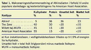 Den vedholdende stigning i overvægt og fedme har forstærket søgningen efter en effektiv kur. Selv om vi i de vestlige lande generelt har sænket vores fedtindtag og samtidig øget indtaget af kulhydrater, er antallet af overvægtige og fede steget, og denne øgning i indtaget af kulhydrat anklages af mange for at være årsag til den blivende fedmeepidemi. Lavkulhydratdiæten, som er beskrevet i Atkins' bog [1], er langtfra den første diæt, hvori det anbefales at reducere indholdet af kulhydrater i kosten. Det gjorde englænderen William Banting allerede for 140 år siden, og forskellige andre forskere har også forslået en kost med et lavt indhold af kulhydrater. Årsagen til Atkinsdiætens popularitet er formentlig, at den tillader et ubegrænset indtag af protein og fedt, samtidig med at den giver et vægttab angiveligt uden nogen form for sultfølelse. I Atkinsdiætens indledende fase er kulhydratindtaget begrænset til 20 g pr. dag [1] i form af salat eller stivelsesfattige grøntsager. Da man i Atkinsdiæten således ikke tillader, at mere end 5-10% af energiindtaget skal komme fra kulhydrater, er den markant forskellig fra andre populære kostanbefalinger [2], hvor der til gengæld fokuseres på mindre fedt i anbefalingerne (Tabel 1 ).