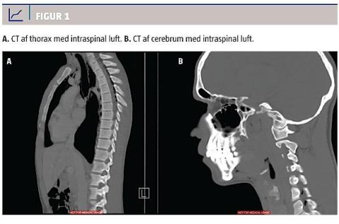 En røntgenoptagelse af thorax viste subkutant emfysem over claviculae og mediastinalt. CT af thorax med intravenøst og peroralt givet kontrast viste subkutant emfysem på collum og i mediastinum samt luft, der strakte sig langs øsofagus dorsalt mod diafragma (Figur 1). Desuden blev der påvist luft intraspinalt og langs enkelte nerverødder på højre side ud til spinalkanalen. Der var ikke mistanke om øsofagusruptur, pneumothorax eller cyster i lungevævet. Ved kontakt til thoraxkirurgisk og neurokirurgisk afdeling blev der anbefalet indlæggelse af patienten til roligt regime og yderligere opfølgning med CT af thorax i det følgende døgn med henblik på observation for progression i luftmængden. En CT-opfølgning dagen efter viste spredning af emfysemet til basis cranii, men ingen luft intrakranialt. Der var på intet tidspunkt neurologiske udfald, og patienten blev udskrevet i klar remission efter tre dages observation.