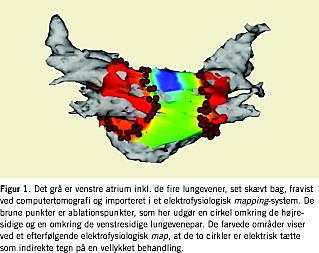 Behandlingsprincippet ved RFA og artrieflimren fremgår af Figur 1 . Herved hindres opstart og vedligeholdelse af atrieflimren ud fra delvist kendte mekanismer. RFA af atrieflimren er under løbende udvikling, og i takt med mere kendskab til atrieflimrens patofysiologi vil fremtidig behandling sandsynligvis blive forfinet med øget effekt og større sikkerhed til følge. Resultaterne af de nyeste studier tyder på, at patienter med hjertesvigt og permanent atrieflimren kan få stor symptomatisk effekt af denne behandling, men den må aktuelt anses for at være eksperimentel, indtil flere studier foreligger [2]. Der udføres for tiden et dansk-skandinavisk-tysk randomiseret studie, hvis resultater vil vise om RFA er bedre end medicinsk behandling tidligt i forløbet af atrieflimrensygdommen, og om den således skal tilbydes før medicinsk profylakse. Patienter i denne sygdomskategori ønskes henvist til de invasive centre på H:S Rigshospitalet, Skejby Sygehus og Amtssygehuset i Gentofte med henblik på en hurtigere afklaring af denne vigtige problemstilling. Udvikling af thoraxkirurgisk baseret atrieflimrenbehandling er også undervejs, men indtil videre anses den for at være eksperimentel.