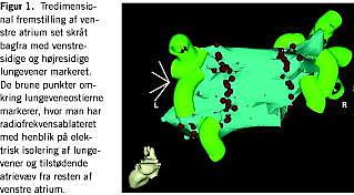 Der savnes fortsat evidens for, hvorledes yngre patienter, patienter med betydelige symptomer trods forsøg på optimeret frekvenskontrol eller patienter med førstegangstilfælde af atrieflimren bedst behandles. Det er betænkeligt, at de kendte antiarytmika med konverterende eller stabiliserende effekt over for atrieflimren enten er behæftet med potentielt livstruende proarytmiske bivirkninger (sotalol, propafenon, flecainid, kinidin) eller er behæftet med langtidsbivirkninger, som med stor sandsynlighed medfører seponering inden for en kortere årrække (amiodaron), og at de samtidig højst er moderat effektive. Nonfarmakologisk terapi af atrieflimren har i de forløbne par år vist lovende resultater ved kateterbaseret radiofrekvensablationsbehandling (Figur 1 ). Resultater fra flere internationale grupper tyder på, at ca. 75% af patienter med paroksystisk eller persisterende atrieflimren kan holdes symptomfri efter kateterbehandling. Komplikationsfrekvensen ved den aktuelt dominerende teknik er ganske lav, men behandlingseffekten over længere followupperioder end ca. to år kendes endnu ikke.
