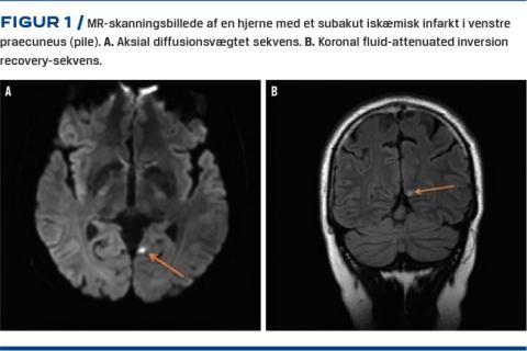En 42-årig frømand, der havde kendt migræne med synsaura og hyperkolesterolæmi, blev indlagt pga. ophobede anfald og ændret karakter af kendt synsaura. Et af hans anfald bestod i pludselig synssløring for begge øjne og fornemmelse af kun at kunne se et lille område af synsfeltet. Samtidig kunne han ikke finde hjem pga. orienteringsbesvær. Symptomerne forsvandt inden for ti minutter og blev efterfulgt af hovedpine. Den neurologiske undersøgelse viste normale forhold. Blodprøver viste flg. værdier: totalkolesterol 6,6 mmol/l, lavdensitetslipoprotein 3,1 mmol/l samt normalt niveau af glykeret hæmoglobin og koagulationsfaktorer. MR-skanning af hjernen otte dage efter debut viste subakut infarkt i venstre parietallap i praecuneus, som medvirker til bearbejdningen af synsindtryk og rumlige sanseindtryk (Figur 1). MR-angiografi og UL-skanning af halskar viste normale forhold, og tre dages Holtermonitorering var uden atrieflimren. Transøsofageal ekkokardiografi viste persisterende foramen ovale (PFO). Patienten fik acetylsalicylsyre (ASA) som bolus, og der blev igangsat forebyggende behandling med clopidogrel og atorvastatin. Clopidogrel blev senere skiftet til ASA pga. bivirkninger, og hans PFO blev lukket. To måneder senere var han i velbefindende uden komplikationer efter indgrebet.