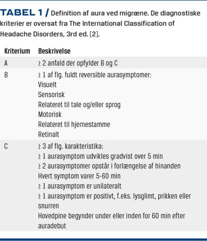 Migrænehovedpine er defineret ved mindst to af følgende karakteristika: unilateral lokalisation, pulserende karakter, moderat til svær intensitet og forværring ved fysisk aktivitet. Hovedpinen ledsages af kvalme/opkastning eller foto- og fonofobi og kommer i anfald af 4-72 timers varighed. Migræne ses hos ca. 13% af befolkningen, og op mod 30% heraf har ledsagende aura [1]. Migræne med aura øger risikoen for blodprop i hjernen to en halv gang [1].