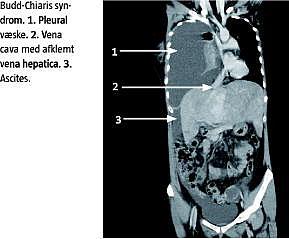 På grund af fortsat uafklaret sygdomsbillede, yderligere forværring af patientens almentilstand og for at udelukke intraabdominal karcinomatose blev der foretaget diagnostisk laparoskopi, der viste moderat endometriose. Ved en fornyet trefaset CT sås vv. hepaticae ikke, og der kunne konstateres nedsat levergennemblødning, der dog var bevaret ved lobus caudatus. En leverbiopsi, der var blevet taget ved laparoskopien, viste forandringer, som var forenelige med Budd-Chiaris syndrom. Patienten blev overflyttet til Rigshospitalet til anlæggelse af transjugulær intrahepatisk portosystemisk shunt [3]. Videre udredning viste positivt resultat for JAK2 V617F -mutationen, som er karakteristisk for myeloproliferativ sygdom.