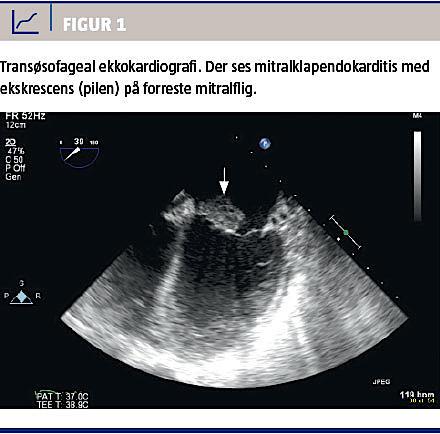 En antistofscreening inkl. screening for antinukleære antistoffer (ANA) og antifosfolipide antistoffer afslørede ingen abnormaliteter. Ved en transtorakal ekkokardiografi (TTE) sås der diskret mitralinsufficiens (MI). Bloddyrkningerne viste vækst af Staphylococcus aureus, som var følsom for cefuroxim, men pga. manglende bedring ordinerede man nye, tidsforskudte bloddyrkninger, der viste vækst af S. aureus, som var følsom for dicloxacillin. Patienten kunne ikke kooperere til transøsofageal ekkokardiografi (TEE), men en ny TTE viste mitralklapendokarditis og moderat MI. Hun blev derfor overflyttet til en højtspecialiseret enhed, hvor man udførte TEE (Figur 1) i generel anæstesi, og hun blev herefter mitralplastikopereret. Ved kontrol tre måneder senere afkræftedes mistanken om SLE, idet hun ikke længere havde udslæt, led- eller almensymptomer, og de biokemiske værdier var normaliseret.