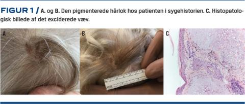 En 95-årig kvinde, som tidligere var blevet diagnosticeret med basalcellekarcinomer (BCC) og havde lys hud af Fitzpatrick type II, blev henvist til en plastikkirurgisk afdeling til behandling af flere nytilkomne BCC’er. Ved forundersøgelsen blev det bemærket, at hun havde en mørk hårlok i det grå hår. Hun havde ingen erindring om, hvor længe den havde været til stede (Figur 1 A og B). Ved nærmere undersøgelse blev der fundet et lentiginøst element på ca. 20 × 20 mm under hårlokken. Klinisk var der mistanke om LM. Læsionen blev biopteret med en stansebiopsi, og histologisvaret viste LMM med en Breslowtumortykkelse på 1,7 mm uden ulceration, dermale mitoser eller regression. Læsionen blev efterfølgende excideret radikalt iht. nationale retningslinjer, og defekten blev rekonstrueret med et delhudstransplantat. På grund af patientens alder, komorbiditeter og hendes ønske blev der ikke udført yderligere undersøgelser med sentinel node biopsi. Hun blev efterfølgende blevet tilbudt ultralydskanning af de regionale lymfeknuder på hoved og hals forud for hver ambulante kontrol.