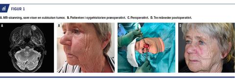 Efter nogle år blev tumoren større, og for at udelukke hoved-hals-cancer blev hun henvist til en øre-næse-hals-afdeling. Ved et finnålsaspirat påvistes der karcinomceller, og samtidig viste en MR-skanning en subkutant beliggende tumor på 37 × 23 × 21 mm uden indvækst i muskelfascie (Figur 1A). Patienten blev henvist til en plastikkirurgisk afdeling på mistanke om recidiv. Hun havde monosymptomatisk vækst gennem 3-4 år uden hudaffektion på noget tidspunkt. Behandlingen var eksstirpation af tumoren og resektion af overskydende hud (Figur 1B-D). Den histologiske diagnose var et subkutant BCC, som var fjernet radikalt.
