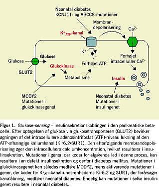I molekylærbiologisk forskning har man påvist atypiske former for (type 1) diabetes. Således kan mutationer i KCNJ11 (KIR6.2)- og ABCC8 (SUR1)-generne eller i insulingenet (INS) (Figur 1 ) medføre en tidligt opstået diabetes, der fænotypisk ligner autoimmun type 1-diabetes (1-3). Lidelsen begynder oftest før 6-7-måneders-alderen, og da diabetes fremkaldt af mutationer i KCNJ11- og ABCC8-generne hyppigt kan behandles med sulfonylurinstof, er det væsentligt, at de opdages tidligt [1]. I et nyligt publiceret studie med 24 børn og unge med nydiagnosticeret diabetes uden autoantistoffer var en 14-årig dreng heterozygot for en mutation i ABCC8-genet. Det tyder på, at mutationerne også kan forekomme hos ældre patienter uden autoantistoffer.