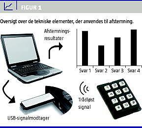 Forelæsninger anvendes ofte til undervisning af store grupper, og de er karakteriseret ved beskeden deltageraktivitet og begrænset mulighed for feedback [1]. Anvendelse af interaktive elektroniske afstemningssystemer, også kaldet audience response - systemer (ARS) eller »klikkere«, er en mulighed for at øge deltagerinvolveringen. Den hastige udvikling inden for computerteknologi og trådløs teknologi [1, 2] har bevirket, at afstemningssystemerne er hurtige at sætte op, driftsikre og enkle at anvende for brugeren. Spørgsmål kan integreres i PowerPoint, besvarelser kan afgives via fjernbetjeninger (Figur 1 ), og afstemningsdata kan vises som grafer eller gemmes til analyse. Internationalt anvendes ARS på flere universiteter [1, 3-5], men systemet er mindre udbredt til medicinsk uddannelse i Danmark. I litteraturen beskrives 1) interaktivitet i form af diskussioner, afstemning og feedback, 2) opmærksomhed og engagement og 3) et sikkert læringsmiljø med anonymitet og tryghed som kerneområder, på hvilke ARS kan bidrage til et øget læringsudbytte [1, 6]. Formålet med denne artikel er at beskrive mulighederne ved anvendelse af ARS samt at redegøre for den aktuelle viden om ARS' effekt på læringsmiljø og læringsudbytte.