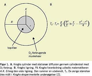 August Kroghs skelsættende lunge- og arbejdsfysiologiske undersøgelser førte til spørgsmålet om, hvordan det forholder sig med musklernes iltforsyning via kapillærerne, som man ikke vidste meget om. Krogh indså, at iltforbruget under arbejde ikke kunne sikres blot ved en øget gennemblødningshastighed, som antaget af andre, men forudsatte øget blodmængde i musklens kar og reduceret diffusionsafstand mellem kapillærer og de iltforbrugende processer. Denne hypotese rummede to spørgsmål: Med hvilken hastighed bevæger O2 sig gennem levende væv, og hvor tæt er kapillærerne fordelt i det O2 -forbrugende væv? Det første spørgsmål ledte til bestemmelse af ilts diffusionskonstant med et nyudviklet apparatur til måling af diffusionshastighed i præparater opspændt mellem to kamre med en kendt ilttensionsgradient [1]. Diffusionshastigheden korrigeret for vævets iltforbrug faldt med temperaturen, og Krogh påviste, at dette beror på øget viskositet ved lavere temperaturer. Den kvantitative sammenhæng mellem ilttension og iltforbrug in situ blev bestemt i muskler, hvor kapillærerne er nogenlunde regelmæssigt fordelt og overvejende er parallelle med muskelfibrene. Krogh antog derfor (Figur 1A ), at hvert kapillær forsyner ilt til en vævscylinder med homogent iltforbrug, p, og radius, R, der er halvt så stor som afstanden mellem to nabokapillærer med radius, r . I »Kroghs cylinder«, hvor ilts diffusionskonstant, d, overalt er den samme, er ilttensionen, Tx , i afstanden x fra karrets midtakse givet ved »Kroghs ligning« i Figur 1B , hvor To er ilttensionen i kapillæret og r< × ≤ R. Ligningen forudsiger, at kapillærtætheden afspejler det artsspecifikke stofskifte, hvilket Krogh efterviste i forsøg med lavere vertebrater og pattedyr af forskellig størrelse [2]. Efterfølgende studerede han reguleringen af åbne kapillærer ved mikroskopi på levende væv og farveinjicerede præparater [3, 4]. I intensive undersøgelser af kapillærer hos frøer og små pattedyr blev flere nye metoder beskrevet og afprøvet. Han fandt, at kapillærer åbnede og lukkede spontant i hvile, og at antallet af åbne kapillærer på et givet tidspunkt var ringe. I den arbejdende muskel øgedes andelen af åbne kapillærer markant. Eksempelvis i tværsnit af diafragma fra marsvin blev en 20 × stimulering af iltoptagelsen ledsaget af en forøgelse af kapillærtætheden fra 31/mm2 til 3.000/mm2 svarende til en kapillæroverflade på ~750 cm2 /cm3 , hvilket sikrede rigelig ilttension overalt i den arbejdende muskel. Krogh konkluderede, at iltforsyningen under arbejde reguleres ved åbning af kapillærer med ledsagende reduktion af diffusionsafstande. I omhyggeligt kontrollerede undersøgelser i binokulært mikroskop iagttoges det, at det enkelte kapillær kan åbnes og lukkes ved lokal elektrisk, mekanisk eller kemisk stimulering. Denne »kapillariomotoriske funktion« antog Krogh skyldes kontraktile Rougetceller (pericytter), hvis udløbere omkranser kapillæret, og som ved stimulering snører kapillæret sammen [5]. Denne mekanisme er i vore dage bekræftet med andre metoder [6].