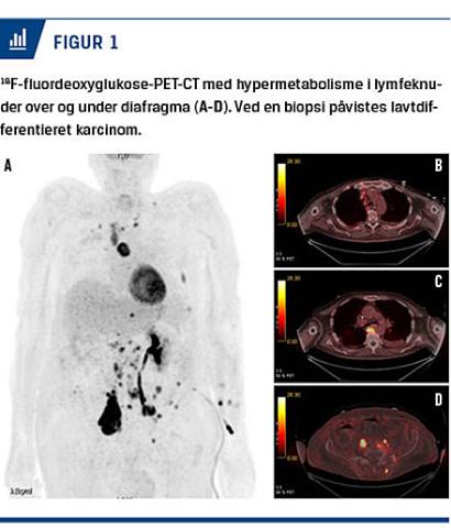 Ved analyse af CSV påvistes der GABABR-antistof-fer i høj titer, og man påbegyndte behandling med terapeutisk plasmaferese (fem gange over ti dage). Efter den anden plasmaferese var den kliniske tilstand i diskret bedring. Patienten åbnede øjnene på tiltale, men var fortsat svært konfus. En fluordeoxyglukose-PET-CT viste multiple lymfeknuder med øget metabolisk aktivitet over og under diafragma (Figur 1), og ved en lymfeknudebiopsi påviste man småcellet udifferentieret cancer. Cytostatisk behandling vurderedes ikke at være mulig pga. patientens almentilstand. Han var dog i cerebral bedring og kunne nu følge personalet med øjnene og genkende pårørende.