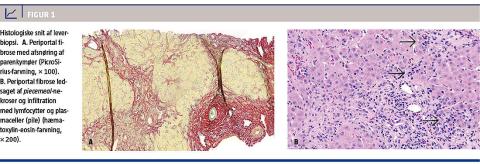 Efter to måneder var BILI-niveauet normaliseret, men pga. vedvarende parenkymatøs leverpåvirkning med et ALAT-niveau på 222 E/l blev der foretaget leverbiopsi. Denne viste kronisk hepatitis med fibrosegrad 3 og moderat inflammatorisk aktivitet, hvilket var foreneligt med AIH (Figur 1). Med baggrund i biopsisvaret blev der iværksat behandling med budesonid 9 mg × 1 dagligt, hvilket normaliserede levertallene i løbet af få uger.