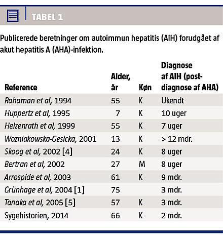 tidligere beskrevet ni tilfælde med udvikling af AIH forudgået af en AHA-infektion (Tabel 1) [1, 3-5]. Mekanismen bag associationen er fortsat ufuldstændigt belyst. I et studie af Vento et al [3] beskrives en genetisk defekt i T-hjælper-lymfocytter (CD4+) hos patienter, der var genetisk disponeret for AIH. Disse patienter blev fulgt med systematiske serologiske undersøgelser gennem flere år, og tre fik i studieperioden en subklinisk AHA-infektion. To af disse tre patienter fik efterfølgende AIH, ifølge forfatterne som følge af en forstyrret interaktion mellem defekte T-hjælper-lymfocytter og autoantigener på hepatocytterne. Der er brug for mere viden om patogenesen, før man kan drage konklusioner om kontrol og opfølgning af AHA i forbindelse med AIH.